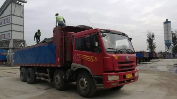 我公司司机师傅正在为装车沥青材料盖上棉被,做好保温,确保质量!
